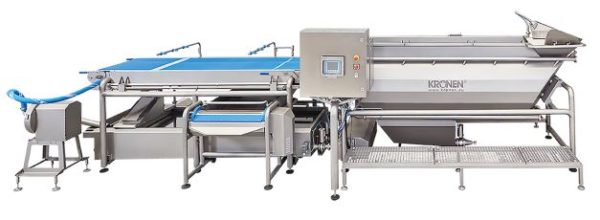 Also with this machine, the KRONEN HELICAL system ensures that the product in the wash tank takes a “spiraling” journey through the wash tank, which equates to a distance of about ten times the wash tank length. The product is, therefore, dispersed throughout the washer, to achieve optimal distribution so that the water can access the product 360° during the cleaning process.The washed products are then conveyed by the water stream to the newly designed belt outfeed system. Above the belt outfeed, two individually connectable spraying devices are installed, with which the products can be additionally rinsed.