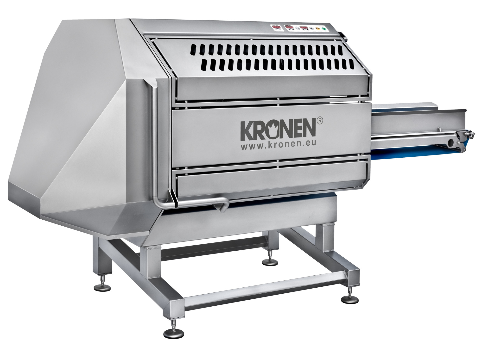 The GS 20 builds upon the strengths of all established KRONEN GS belt cutting machines. The knife cover allows for an optimized product outfeed and thus a gentle product handling. To ensure consistent cutting quality, the GS 20 includes as little wear parts as possible. Indicator lights show the status of the safety sensors. The locking system, combined with the belt cover, ensures safety in the area of the knife. As with all KRONEN machines, its excellent hygiene qualities are a major advantage: Inclined surfaces, stainless steel shaft seals and the elimination of screws in the cutting chamber door area, a seamless knife edge, etc. contribute to the improved performance of the GS 20 belt cutting machine.