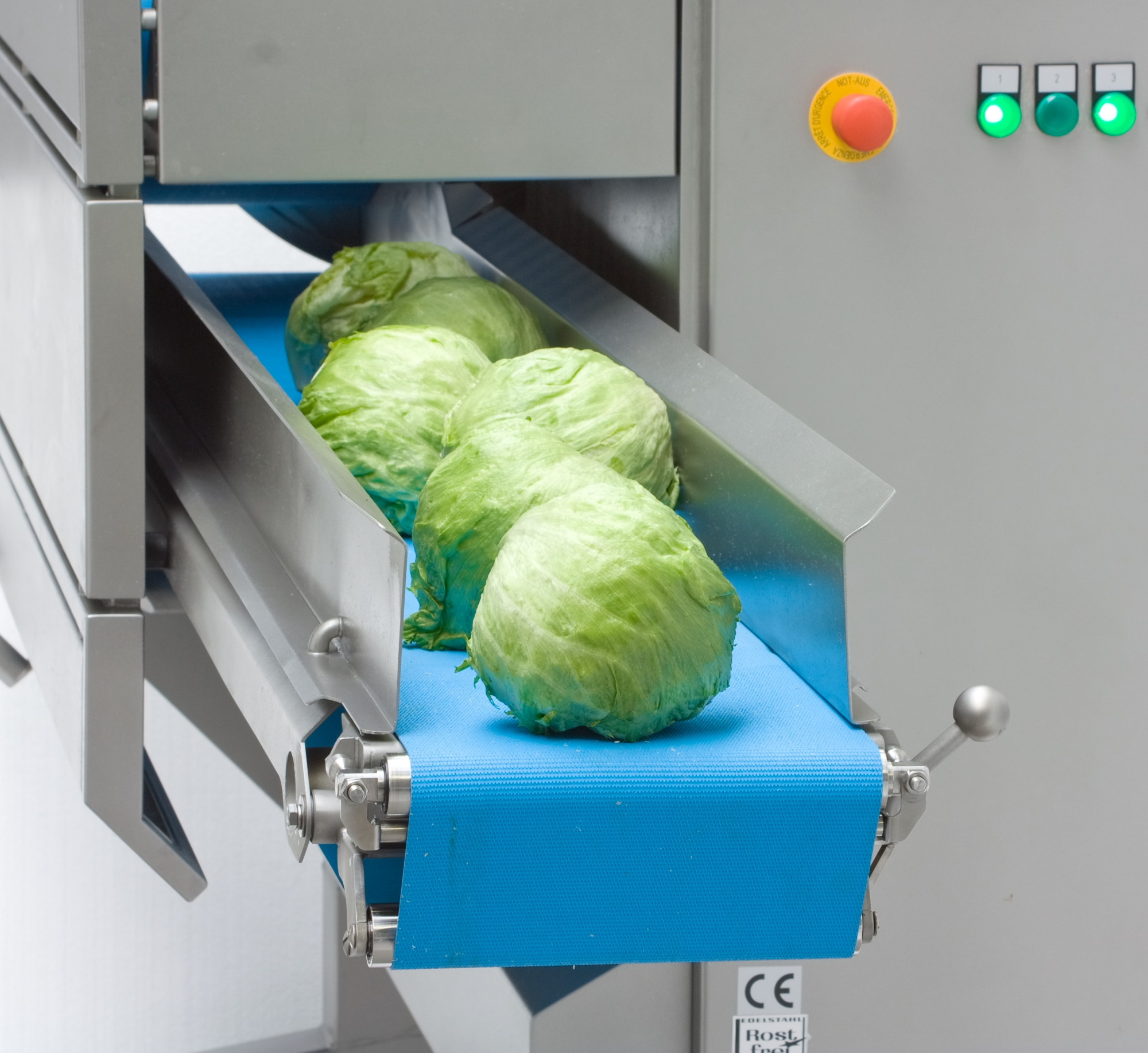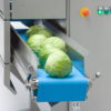The GS 20 belt cutting machine is equipped with a conveyor belt 250 mm wide and a product down-holder to apply gentle pressure for product control. This key feature holds and controls the product until point of cutting. Individually definable programs can be stored and selected by the simple use of control buttons and features digital in-motion cutting size adjustment from 1 to 50 mm using a knife with 3 blades. The GS 20 feeding belt has been designed to convey whole heads of lettuce or cabbage.