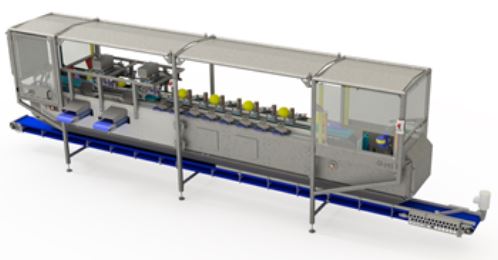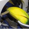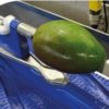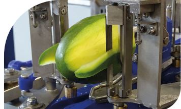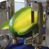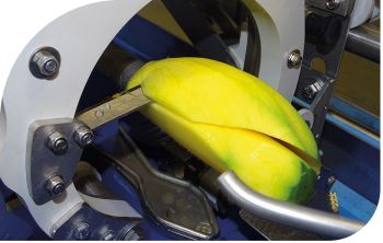 The mango is peeled in the same way as if it would be peeled by hand. Blades peel end to end following the contours of the fruit. The result of this peeling method is a beautifully authentic and smooth cut. After peeling, the mango cheeks are cut from the stone with two sharp, bowl shaped oscillating knives. This unique processing method increases the shelf life of your fruit because juice loss and damage to the mango is vastly reduced. Yield results are also very high because of the consistent and accurate peel and cheek removal.