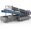 The conveyers will transport the product gently through the washing process. Air bubbles from the bottom supports the removal of dirt and spins the product while from the top water sprays. Perforations in the under belt ensures sand and other dirt to wash and fall off.