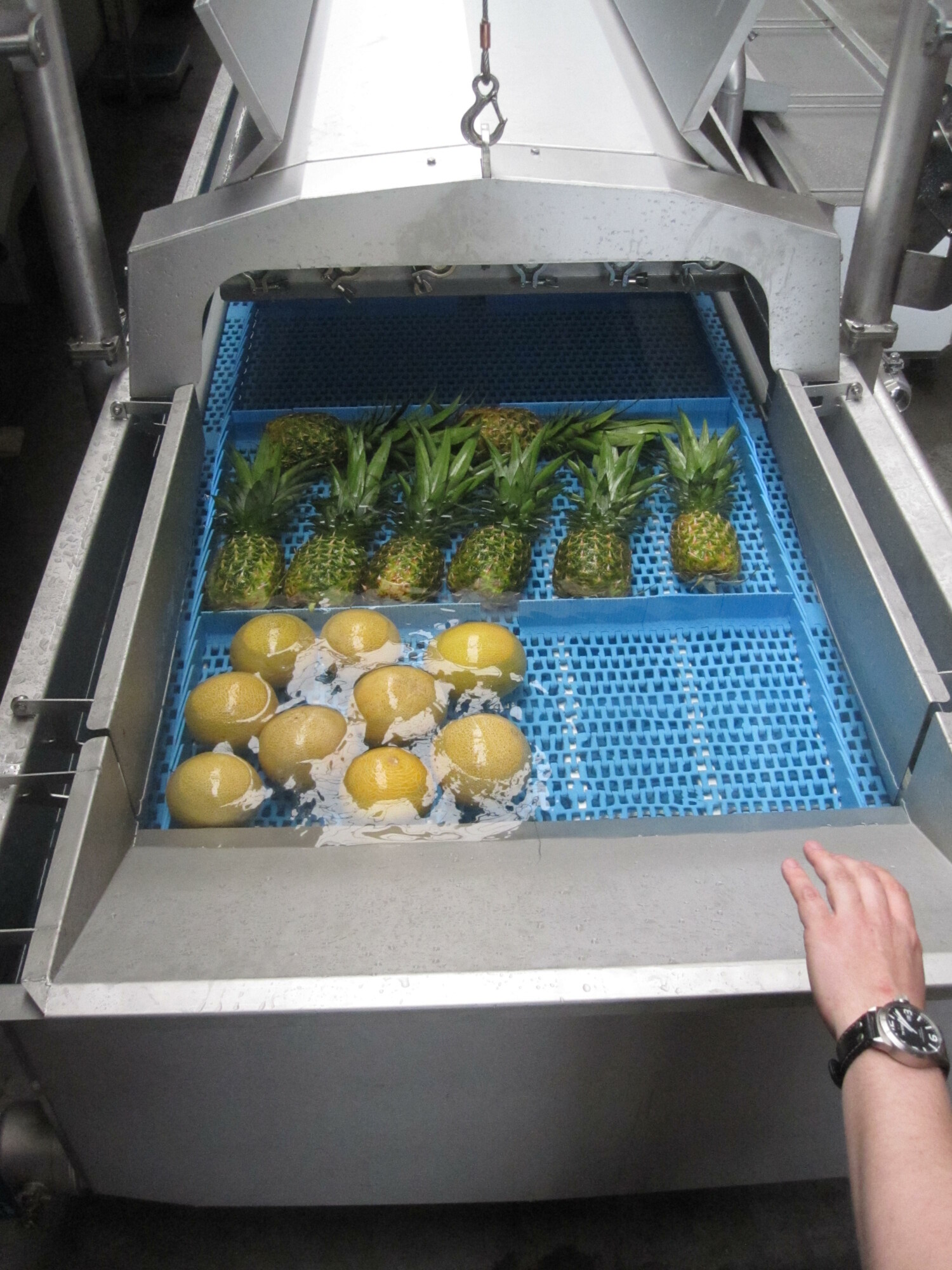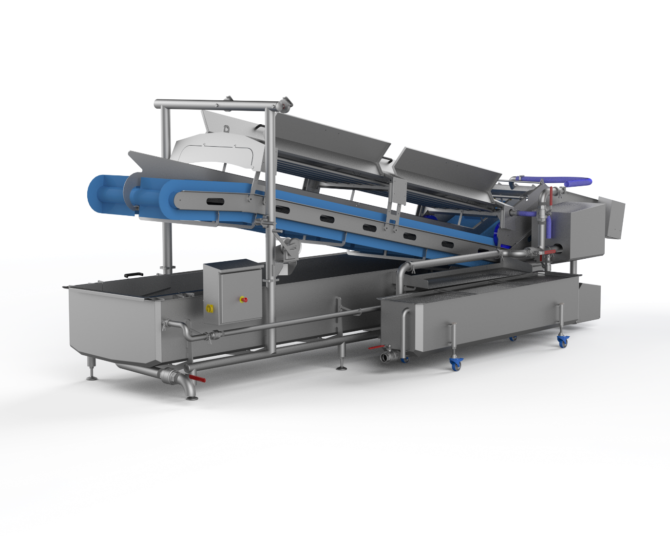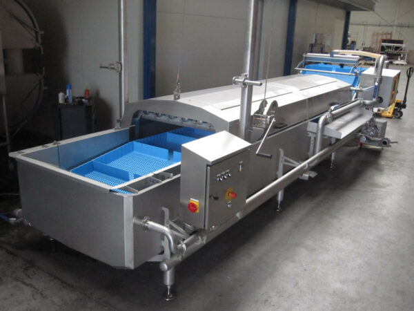 At the outfeed section the product gets dewatered by an adjustable air knife. The hood has easy access doors, and can be lifted on one side for easy cleaning. Construction the machine is made of stainless steel (304) and food grade polymers. Round materials are used whenever possible to ensure proper hygiene.