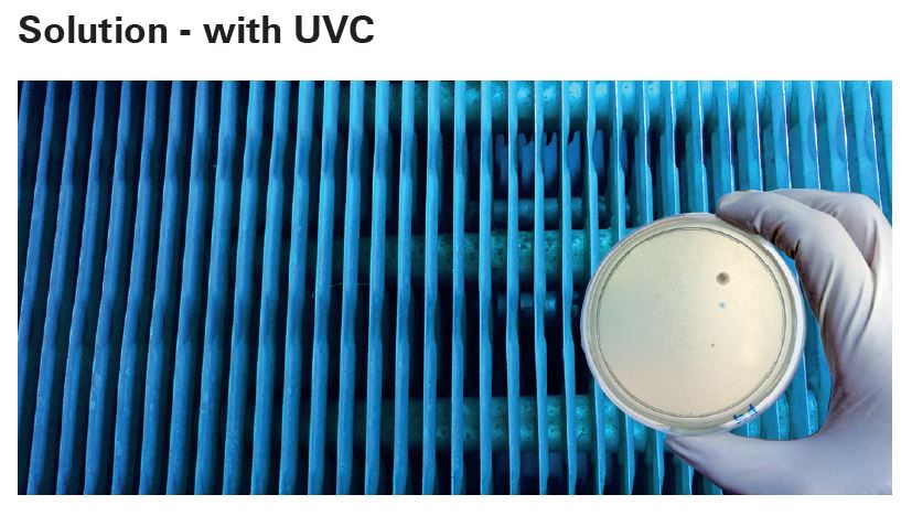 sterilAir® offers a powerful and environmentally friendly solution. Our UVC installations sustainably prevent build up and growth of biofilm. Clean coils keep energy consumption of the cooling unit constantly low. The slats remain hygienically flawless, cleaning effort and frequency decrease significantly – a considerable cost saving in operation and maintenance. The reduced airborne microbial count also minimize the risk of cross-contamination to your products. The result: improved food quality and assured shelf life data.