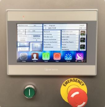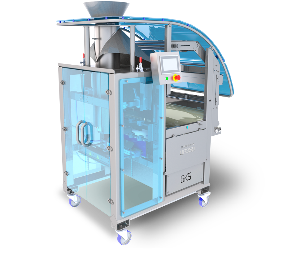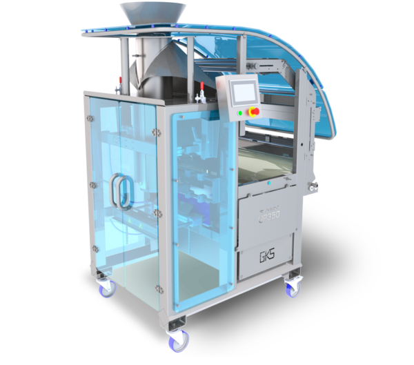 Stainless steel construction; hygienic design. Machine safety according to CE regulations. Allen Bradley PLC with 7” full colour touchscreen and 99 programs can be created and stored. Photocell for bag length detection with pre-printed film. End of film detection. Pneumatic opening and closing of the servo driven film pull belts. Low power and air consumption. Cover plate over the entire machine. Machine in mobile frame.
