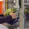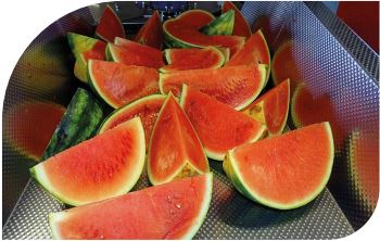 The Watermelon Wedger is equipped with a three position turntable. The turntable moves the watermelon into the next position during processing. The fruit is manually placed on the first position. After turning to the second position the melon will be cut into two, four, six, eight, ten or twelve equal pieces. After the cutting process the table turns to the third and last position. Here the fruit is gently tilted out of the Watermelon Wedger machine and the wedges slide carefully onto a stainless steel transfer chute.